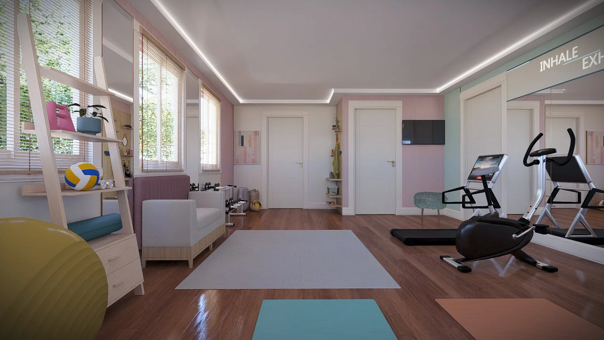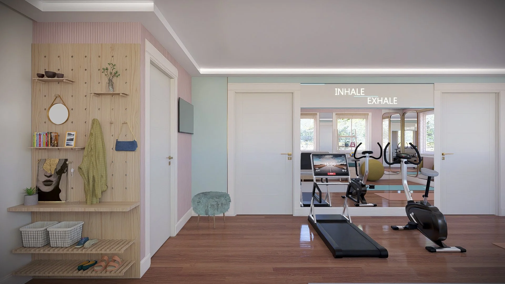 We reimagined the space as a light, feminine workout zone.