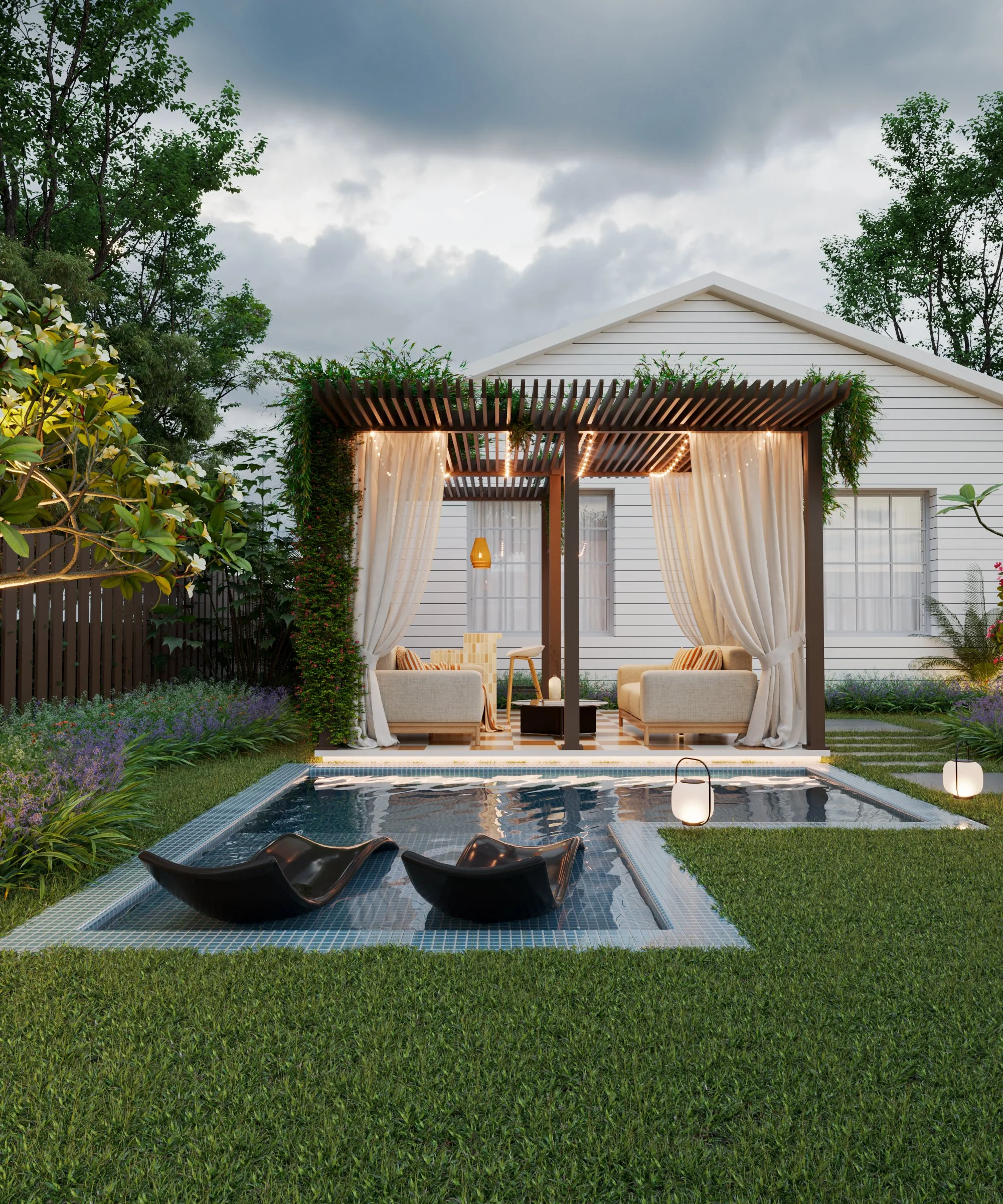 Her studio space was dark, meh and uninspiring. And her backyard? Underused, with no sense of retreat or flow- she wanted to maximize her pergola AND she wanted a pool in her awkwardly shaped backyard